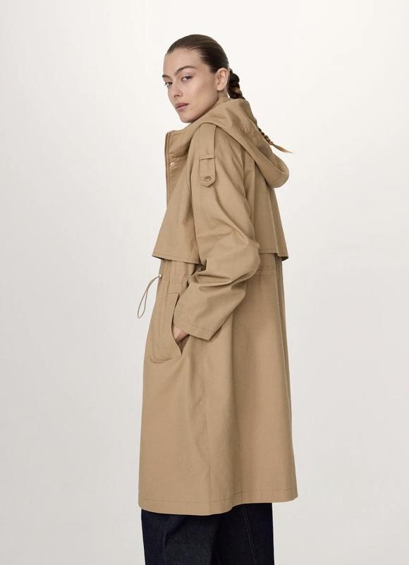 Тренч с капюшоном, на полкладке, пояс на кулиске, можно регулировать в объеме талии. Размер S