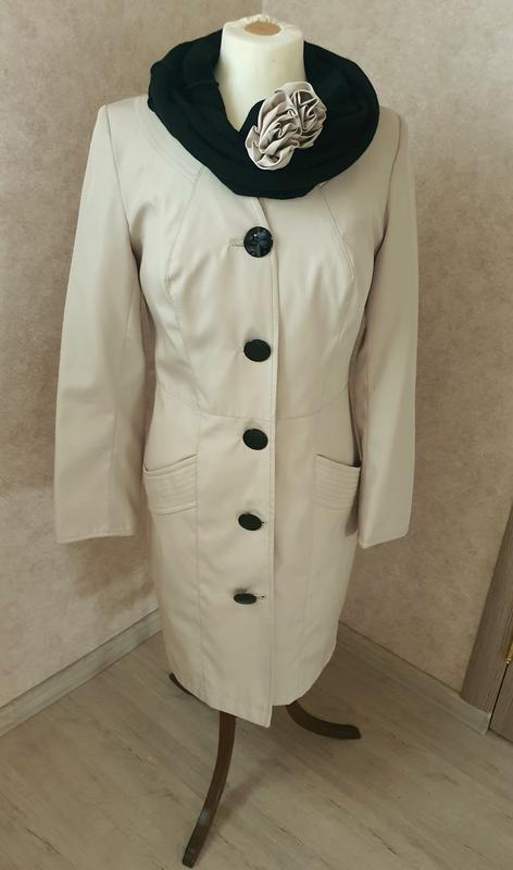 Женский плащ, приталенный. Застегивается на красивые черные пуговицы. Имеет два кармана. Также идет в комплекте шарф хомут. Размер 42