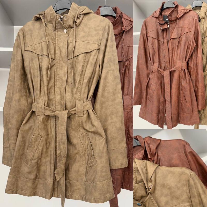 Єко шкіра Капюшон зьйомний з поясом В двох кольорах: корич С, хакі М, Л, ХЛ Розміри С - ХЛ С: ПОГ 46, рукав 61, довжина 78 М: ПОГ 48, рукав 61, довжина 78 Л: ПОГ 50, рукав 61, довжина 78 Хл: ПОГ 51, рукав 61, довжина 78