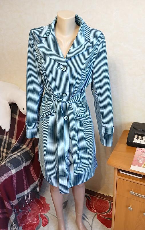 Легкий весенне-осенний женский плащ на подкладке. На пуговицах, с поясом. Стан идеален. Размер L/XL Ширина плечей 42 см Полуобхват груди 51 см (Ширина подмышками. Есть вытачки, подойдет и на более большую грудь) Ширина по поясу 46 см Полуобхват бедер 55 см Длина рукава 64 см Длина 96 см