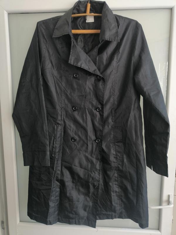 Черный плащ, тонкий, на подкладке. Подойдет в качестве дождевика. Длина 95, плечи 44, рукав 64/50, ширина под рукавами 57