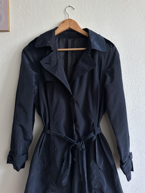 Стильний темно-синій тренч у класичному фасоні. Легка, але щільна тканина — ідеально для весни та осені. Прямий крій, двобортна застібка на гудзики, пояс на талії, декоративні погони на плечах та хлястики на рукавах. Є знімний пояс для регулювання посадки. 📌 Деталі: • Матеріал: 100% поліестер (зовні та підкладка) • Колір: темно-синій • Розмір: 48 (орієнтовно S-M, уточнюй заміри) • Стан: дуже добрий, без пошкоджень • Довжина нижче стегон Елегантний відтінок темно-синього робить його універсальним — пасує і до ділових, і до повсякденних образів.
