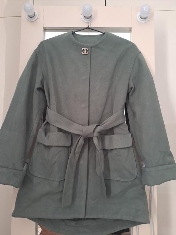 Плащ женский оливкового цвета на заклепках с двумя карманами и поясом В наличии размер 42 Ткань искусственный кашемир