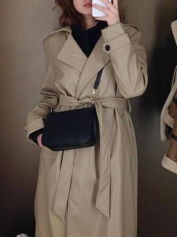 Жіночий плащ з ременем класичного фасону виготовлений з Еко шкіри бежевого кольору. Розмір М(38), є підкладка та добре тримає форму. Підійде на осінь або весну. Без дефектів.