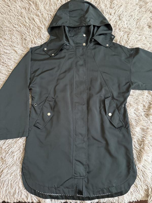 Длина сзади 85см, перед 80см, ширина под руками 55см, полуобхват бедер 54см, плечи приспущены - ширина по плечам 64см, длина рукава от плеча 47см ( рукавчик идет обычный за счет приспущенного плеча). В середине есть кулиски, при желании можно затянуть, капюшон отстегивается, рабочие карманы, цвет темно - зеленый.