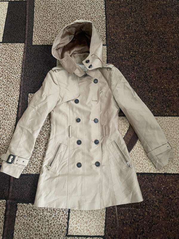 класичний жіночий бежевий тренчкот. Характеристики моделі Тип: Двобортний плащ із капюшоном, який застібається на ґудзики під горло. Деталі: Має характерні для тренча еполети (погони) на плечах, ремінці з пряжками на манжетах та кишені на блискавці. Стиль: Базовий елемент гардероба, що підходить як до класичного взуття (лофери), так і до спортивного стилю (кросівки).