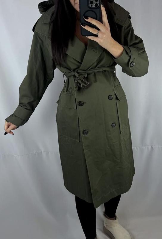 Плащ-тренч выполнен из хлопкового текстиля. Модель прямого кроя с поясом. Детали: съемный капюшон, отложной воротник с лацканами, двубортная застежка на пуговицы, 2 кармана, текстильная подкладка.