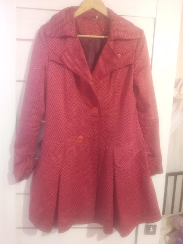Плащ до коліна! Колір червоний в білий горошок! Є два кармани!