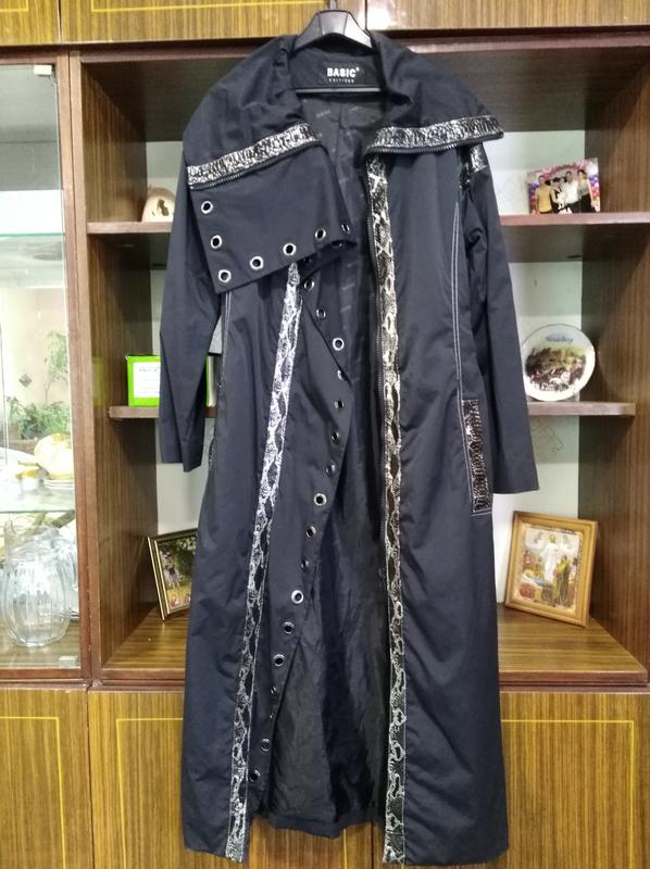 Плащ миди графитового цвета, декорирован металлическими кольцами и выставками под рептилию. На молнии, с поясом. Размер указан 46. пойдет и на 48. Длинна 125 см., рукав 57 см., пот 50, пог (под мышками)53 см. Состав: 55 % полиамид, 40 % коттон, 5 % спандекс. Подкладка 100% полиэстер. Имеется изъян (на последнем фото) прожгла сзади воротник. Легко можно устранить. В цене учтено.