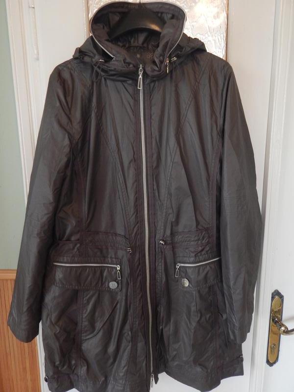 Нова. Дуже гарна довга вітровка, не утеплена тільки підкладка, клір сіро-коричневий. Капішон застібується у воротнік на замочок. Довжина 83см, плечі 43,5см,довжина рукава 62см, ширина рукава верх 19см, низ 14см. ПОГ 55см, ПОП 51см затягується на шнурок. Низ 61см. ПОбедр 58см.