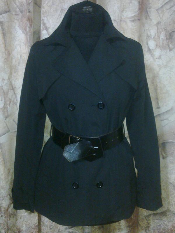 Стильный полу-плащ. черного цвета, приталенный по фигуре, цельный (неотрезной), под красивый, черный пояс, двубортный, с отворотами. Имеет спереди кокетки-пелерины, накладные, округленные. По боках есть врезные карманы. На рукавах имеет пояски-хлястики на пуговках. Полностью, на подкладке. Изготовлен брендовой, итальянской фирмой ATMOSPHERA, из 100%полиэстера, приятная, мягкая, плащевочная ткань. Шитье и качество, на высшем уровне!!! Новый, есть навесные, запасные пуговки в пакетике и бумажные контрольные бирки. Размер 44-46 М. ЛОТЫ КОМБИНИРУЮ!!!
