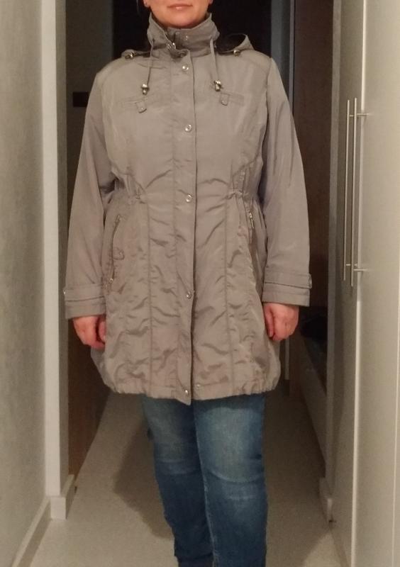 Відмінний легкий плащик зі з'ємним капюшоном стан дуже хороший, вся фурнітура на місці, єдиний недолік видно на фото-кілька маленьких цяток від маркера на полкладке. Утягивается по талії і низу еластичними шнурами. Колір сіро-коричневий практично передався, при яскравому денному освітленні відливає металіком з пудровр-рожевим відтінком. Надіто на зріст 175, ПОБ 116, ПОГ 116, ПІТ 93. Заміри ПО під пахвами 63, ПОБІДИ 66, плечі 46, рукав 64, довжина по спинці 89.