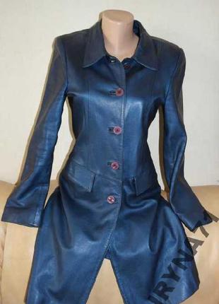 ПЛАЩ кожаный PUNTO. Указан размер М, но идет на XS-S (смотрите мерки). Плащ на пуговицах, приталенный, спереди 2 кармана. Цвет - синий перламутр. Приблизительные размеры: плечи-40см, ПОГ-43см, ПОТ-38,5см, ПОБ-44см, длина рукава-60см, длина по спине-88см. Состояние-б/у (дефектов нет).
