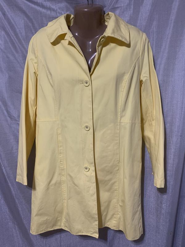 Яркий желтый плащ, верх плотный хлопок, подкладка - полиэстер. Замеры: длина - 89см., плечи - 42см., рукав - 60см., ПОГ - 55см., ПОТ - 52см., ПОБ - 57см