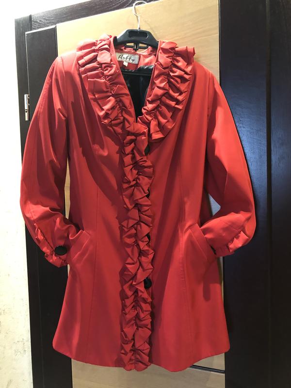 Гарний плащ з рушей)Носила один сезон.Довжина 83 см,з плечей 37,по грудях 46.