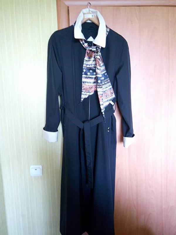 Шикарний жіночий плащ-полегшене пальто чорного кольору з обробкою молочного кольору великого розміру (56-60) з серії люкс одяг. Виробництво Туреччина. Тканина таффета. Гудзики приховані планкою. На фігурі сидить дивовижно, приховує всі недоліки. Заміри Пог-63, побіди-68. Довжина 137. В комплекті пояс і 2 шарфа.