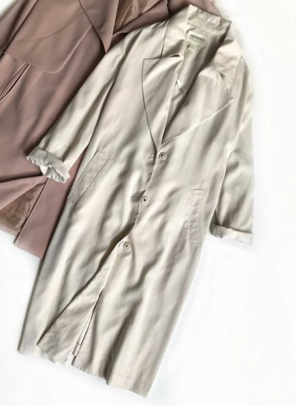 Стильный лёгкий тренч молочного цвета. Размер XS-S. С карманами. Небольшие разрезы по бокам. Без подкладки, внутри все швы окантованы (видно на фото). Застёгивается на кнопки. Состав материала: -69% лиоцел - искусственное волокно производимое из древесины эвкалипта, лиоцел очень дорогой; -31% полиэстер. Длина 101,5см. Обхват груди 110см. Ширина спинки 42см. Длина рукава 53,5см (линия плеча спущенная). Одевалось один раз.