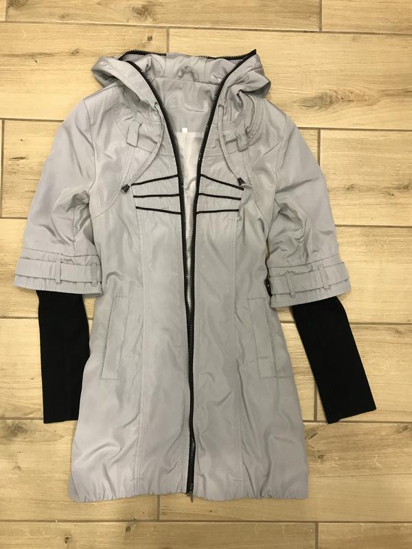 Плащ с капюшоном и трикотажными рукавами. В реальности цвет светлый серо-голубой. Рукава на пуговичках внутри, можно отстегнуть трикотажную чёрную часть и будет до локтя длина. Змейка для декора идёт до самого верха. Можно закрываться от ветра) также хорошо защищает от дождя, не промокает. Размер xs За доп. фото, замерами -пишите Отправка укрпочтой, новой почтой.