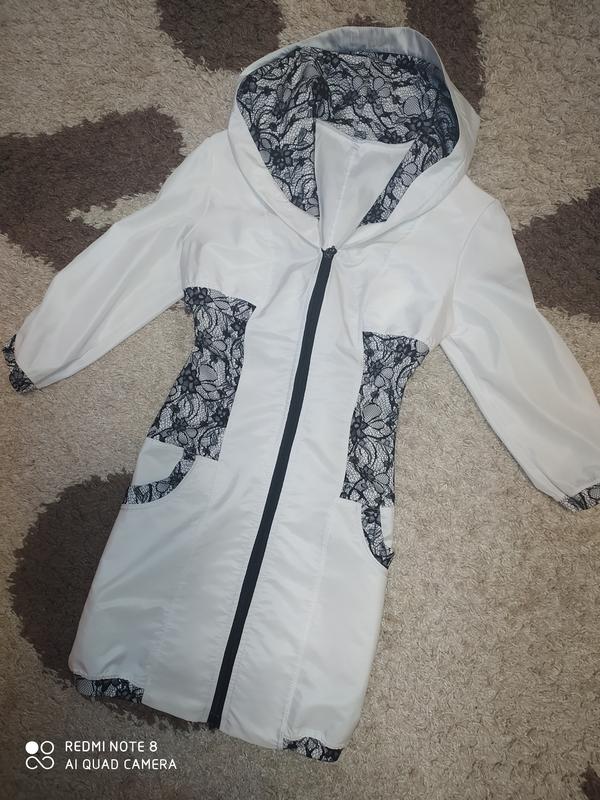 очень красивенькая курточка, приталенная, полностью по фигуре, длина 80 см, рукавчик 3/4.