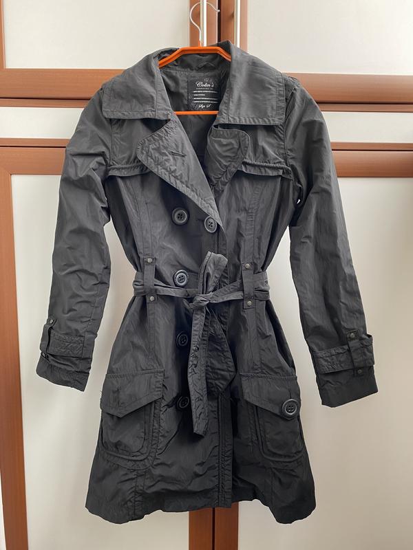 Тренч плащ Colins отличное качество, цвет насыщенный черный Длина от плеча 88 см рукав 62 см ОГ 46 см состояние новой вещи, единственный нюанс, утеряна одна пуговка на кармане, можно перешить ее со спинки, а туда докупить новую любую