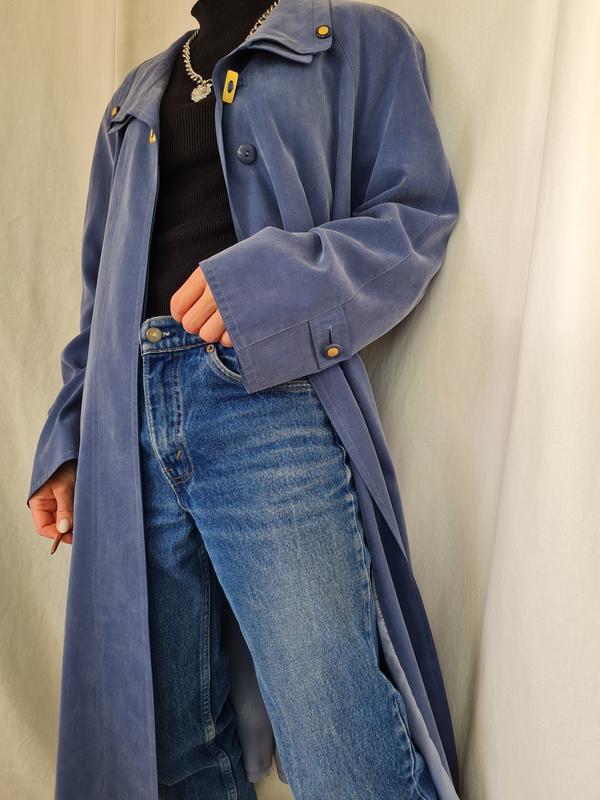 Винтажное пальто с акцентом на плечи M@rconа красивого голубо-синего оттенка. Я бы описала этот оттенок цвет летнего неба перед грозой, может васильковый. В реальности ну очень красивый цвет, который будет прекрасно сочетаться с деним и другими тканями. За счет кроя пальто одновременно базовое и акцентное. По бокам интересные элименты, красивая подкладка в тон, рукава можно подвернуть. Состояние нового, идеальное. Есть запасные пуговицы. Состав: 70% модал, 30% полиэстер. Подкладка 60% ацетат, 40% полиамид. Длина 105 см + 2,5 см воротник