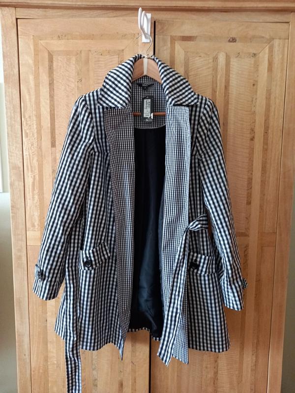 Елегантний плащ без гудзиків легкий, зручний 100% поліестер розмір 12 Англія , 44 Україна довжина рукава 64см ширина плечей 40см ширина талії 55см ширина внизу 66см довжина ззаду 81см ширина пояса 5см клітинка 0.5 х 0.5 см, 0,25 х 0.25 см