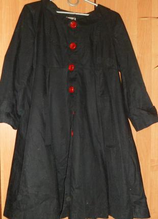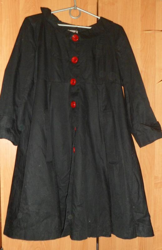 Чорний плащ в стилі бебі дол. Дуже цікаво виглядає. Підійде на вагітність. Я поміняла гудзики на червоні, так образ виглядає завершеним. додаткові заміри і фото не надаю.