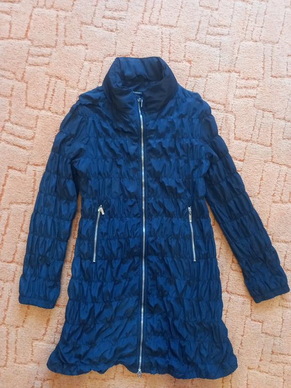 Тёмно синий,почти чёрный цвет, размер М длина 85см,грудь 85-97см,бедра 90-105см,рукав 57см,карманы на молнии, стойка воротник открывается на капюшон,основная молния двусторонняя,подкладка