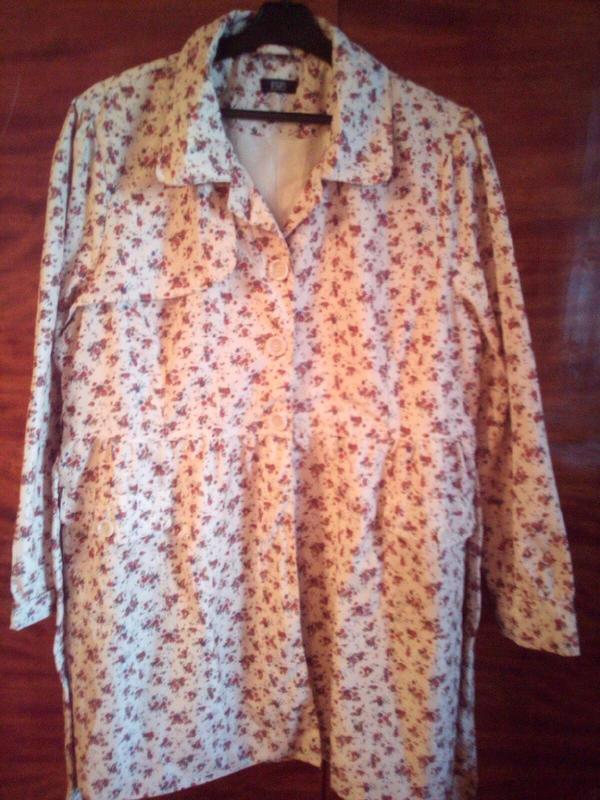 Суперский плащик в цветочный принт,с карманами и пояском.Имеет подкладку.Пог-60 см.Пот-55 см.Длина-92 см.По бёдрам свободный.Без следов носки.Ткань мягкая, приятная на ощупь плащевка.