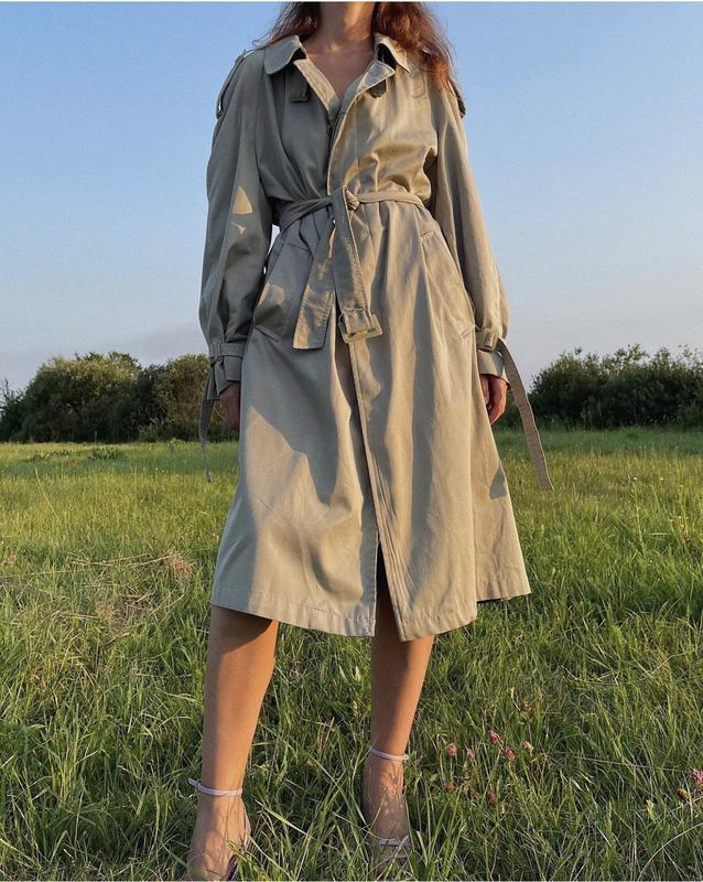 Винтажный классический тренч Шикарная базовая вещь. Отлично подойдёт на прохладную осень, плотная ткань и добротная подкладка. Два глубоких внутренних кармана, скрытый ряд пуговиц, сзади разрез. Манжеты регулируются ремешками. Состояние идеальное! Размер 42. Длина 112 см, приметная длина рукава 65 см (нет плечевого шва), полуобхват груди 63 см, глубина разреза сзади 51 см. Бренд Swallow Бирки с составом нет, тактильно плотный качественный хлопок.