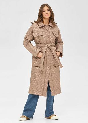 Демисезонный удлинённый стеганный плащ с накладными карманами. Характеристики: — прямой силуэт — спущенная линия плеча — отложной воротник — центральная застежка на пуговицы — 2 нагрудных клапана — 2 накладных кармана — пояс в комплекте — на подкладке — утеплитель силикон ( 80 г/ м2) Состав: Верх – 100 % полиэстер Подкладка – 100 % полиэстер Утеплитель – 100 % полистирол ПЛАЩ АБСОЛЮТНО НОВЫЙ, ЕСТЬ ФИРМЕННАЯ БИРКА. ОВЕРСАЙЗ. НА ГРУДЬ ДО 115 СМ