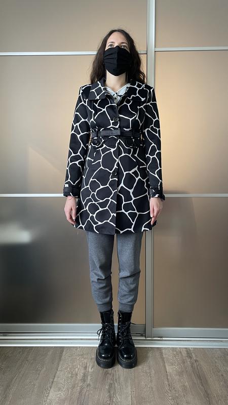 Плащ тонкий з підкладкою в анімалістичний прінт. З пояском зі штучної шкіри. На фото вдягнений на ОГ 91, ОТ 70, ОБ 98 см, зріст 174 см.