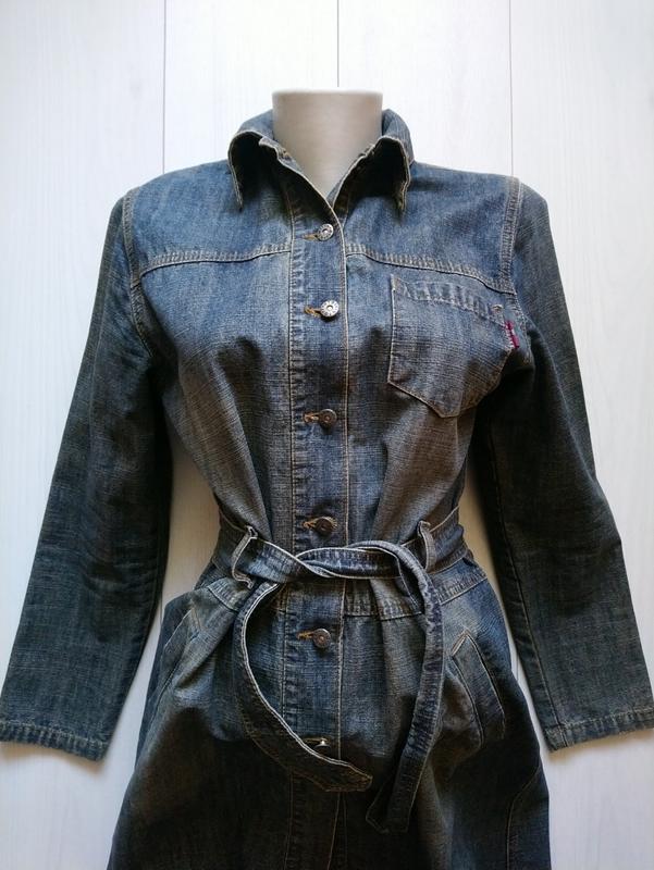 Джинсовий плащ в ідеальному стані Матеріал котон тоненький Джинс Розмір М Довжина від плеча до низу 99 см, В плечах 38 Під руками 46 Рукав від плеча 59 см Півобсяг пояса 41 см і стягується поясом Півобсяг стегон 52 см