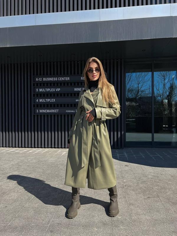 Тренч з еко-шкіри на підкладці Розміри: S-M; L-XL Тканина:шкіразаминнік на замші + підкладка Кольори: чорний, мигдаль, капучино, небесний, оливка