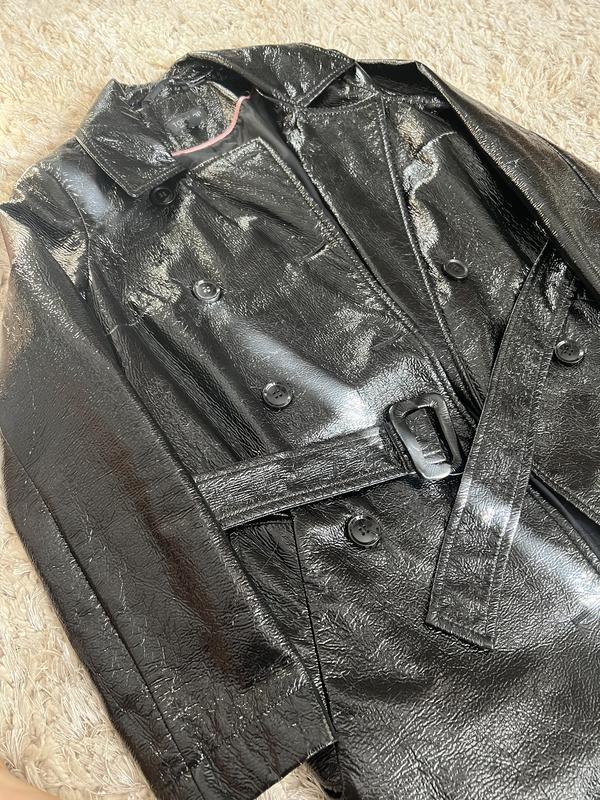 Довжина виробу від плеча 102 см Напівширина плечей 38 см Довжина рукава 58 см Напівширина талії 47 см В ідеальному стані, торг. Дефект зігнута пряжка на поясі.видно на фото