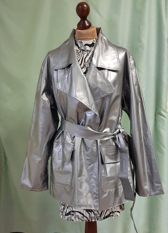 Стильний плащ від дощу сріблястого кольору з поліуретановим покриттям. Оверсайз – підійде від розміру 48 до 54, тому що без застібки, без виточок, під пояс на запах, шви з подвійним відстроченням. Є дві великі накладні кишені з декоративним клапаном, довгий пояс, плащ на підкладці. Дефектів немає. ТКАНИНА: поліуретан РОЗМІР: (оверсайз) 48 – 54 СТАН: відмінний ЦІНА: 560 грн. ДИ = 78см ДР =63 см ПОГ = 55см ПОБ=60см Шир.плечей=50см
