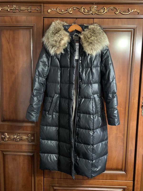 Шикарне зимове стьобане (дуже тепле) пальто-пуховик преміум якості з натуральним хутром. На підкладці. Утеплення - пух/перо. З капюшоном. Капюшон з густим пишним набитим коміром з натурального хутра. Хутро на капюшоні зйомне, на ґудзиках. Внутрішній рукав з трикотажу. Застібка - металічна блискавка та планочка з металічними кнопками. Тканина верху високої якості, приємна, щільна, водовідштовхувальна, з легким матовим блиском. Пух в пальто не вилазить. В комплекті – пояс з металічною пряжкою. Пальто дуже хорошої якості, виглядає дорого. Одягалось дуже мало, 2-3 рази на вихід. Після хімчистки. Стан - нового. Дефектів чи пошкоджень немає. - Розмір - М/Л • Пог - 51 см • Ширина плечей - 41 см / 41,5 см • Пот - 47 см • Поб - 54 см • Довжина рукава - 64 см • Довжина пуховика - 112 см