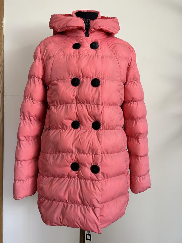 Красивый пуховик розово-кораллового цвета. Состояние отлично. Размер S, небольшая М. За счет резинок внутри можно регулировать объем в области талии. Длина изделия от шеи - 77 см Довжина рукава ззовні- 62 см; внутр. - 46 см. Капюшон не снимается.