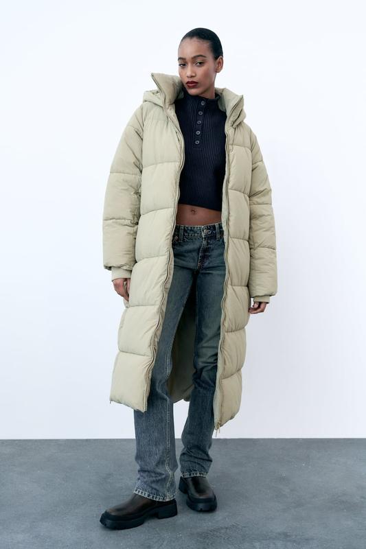 Стьобаний водовідштовхувальний анорак дуже довгого крою з високим коміром, капюшоном і довгими рукавами. Застібається на блискавку спереду. Кишені у шві з блискавкою по боках, функціональні ремінці-підтяжки всередині, бічні блискавки внизу та внутрішні манжети з неопреновим ефектом на рукавах. Відповідно до лабораторних випробувань наповнювач цього виробу здатний утримувати тепло при температурах до -20 °C. По бірці XS-ка. На XS-S. Виглядає класно. Якість чудова.