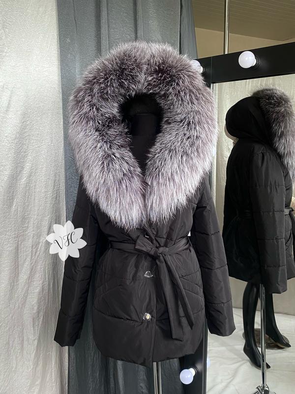 Пуховик-плащ черный женский короткий с натуральным мехом финской чернобурки. размеры 42-54