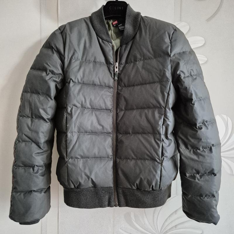Пуховик бомпер Diesel зеленого кольору. Размер S подойдет и на М. Замеры на фото. В хорошем состоянии присутствует незаметный нюанс на одном рукаве и потертости в районе карманов. При необходимости скину дополнительные фото