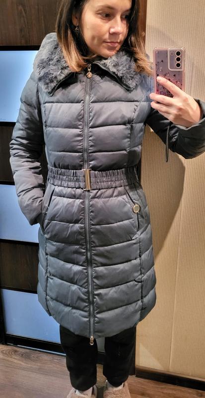Пуховик женский, размер S, цвет синий. Наполнитель - натуральный пух/пряжение. Хутро- кролик. Превосходное состояние, единственный недостаток – не хватает одной петельки на капишоне.