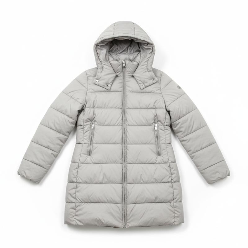 Полуобъем груди - 53 см Полуобъем талии - 51 см Длина - 85 см Длина рукава - 63 см Верхний слой: 100% полиамид Подкладка: 100% полиамид Набивка: 100% переработанный полиэстер Пуховик подходит на холодную зимнюю погоду, не пропускает влагу, имеет теплый капюшон на кнопках, который можно снять, и есть два вместительных кармана на молнии.