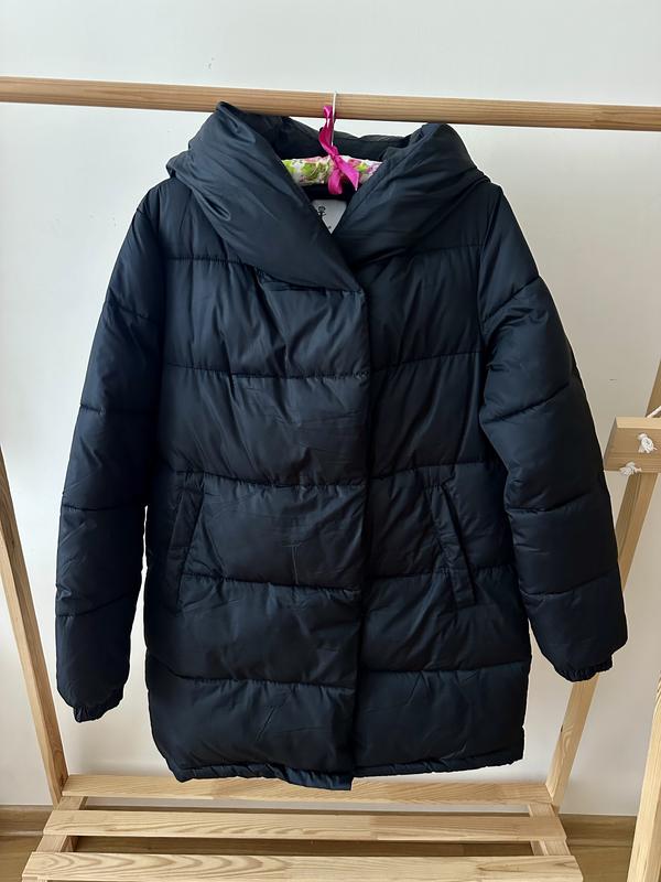 чорний пуховик середньої довжини з капюшоном та горизонтальною прострочкою Заміри Плечі 41 Груди 55,5 Талія 57,5 Бедра 58 Довжина рукава 64 Довжина виробу 80 Відправлення Новою,Укр поштою.
