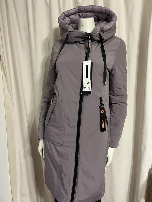 Жіноча зимова довга куртка-пальто блідо-лілового кольору з капюшоном.Два кармана з блискавками зовні та один всередені.Застібка на подвійну блискавку,що відкривається і знизу,і зверху.Крій прямий Куртка легка та тепла.Розмір 46/48(укр),орієнтуйтесь за замірами:напівобхват шрудей 54(і талії,і стегон),довжина рукава 63 см,довжина куртки 100 см,ширина плечей 40 см.