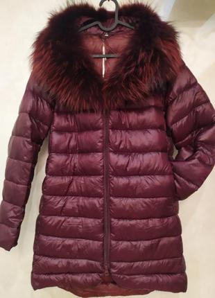 Шикарный пуховик с натуральным воротником. Мех снимается и можно ворот застегнуть под подбородок.Модный в этом году цвет бургнунд с переливом. В наличии осталось мало размеров. 52 р. Полномерные! Пог 62 см Пот 65 Поб 67 Ширина плечи 47 длина по спинке90 см длина спереди82 Длина рукава 65
