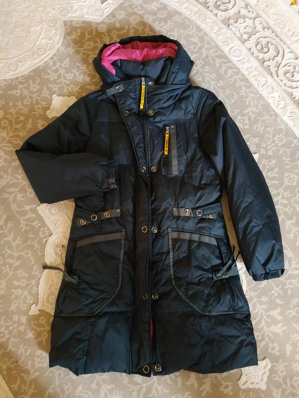 Пуховик фирмы Loft. Размер ХL, 42-44. Наполнитель пух, очень теплый, капишон отчипается. Длина 91 см, длина рукава 65 см, ширина рукава у плеча 27 см, ширина рукава на запястье 13 см, ширина полуобхват плеч 44 см, полуобхват груди 54 см, полуобхват талии 51 см, полуобхват низа 64 см. На талии и на рукавах ширина регулируется.