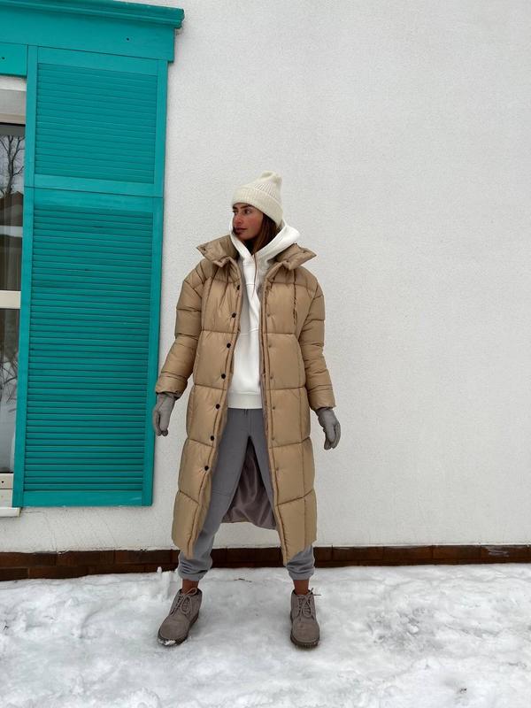 Пуховик дутый с капюшоном Материал: водоотталкивающая плащевка Наполнитель эко пух 250 плотность Температурный режим до -25 Капюшон съемный ,на кнопках Цвета: чёрный , белый камень, кэмел Размер: S, M Есть видео обзор