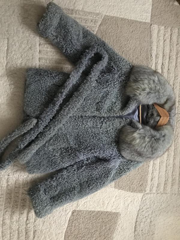 Шуба каракулевая с песцовым ковниром, на поясе. Очень теплая, приятная на ощупь. Цвет серо-голубой.