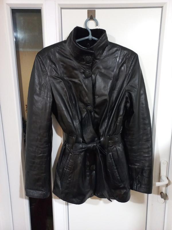 Натуральная дубленка / куртка. Верх из натуральной кожи, низ натуральный мех мутона. За счет двух очень теплая, до минус 20. Дело в отличном состоянии, без дефектов и потертостей. Под пояс. Имеет два врезных кармана. Высота по спинке 70см, рукав 62+3 см манжет, пог 50, пот 42, поб 50, плечи 42. Производство Турция.